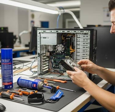 Limpieza física de componentes: El polvo es el enemigo número uno de los servidores y notebooks, causando sobrecalentamiento y fallas de placa.